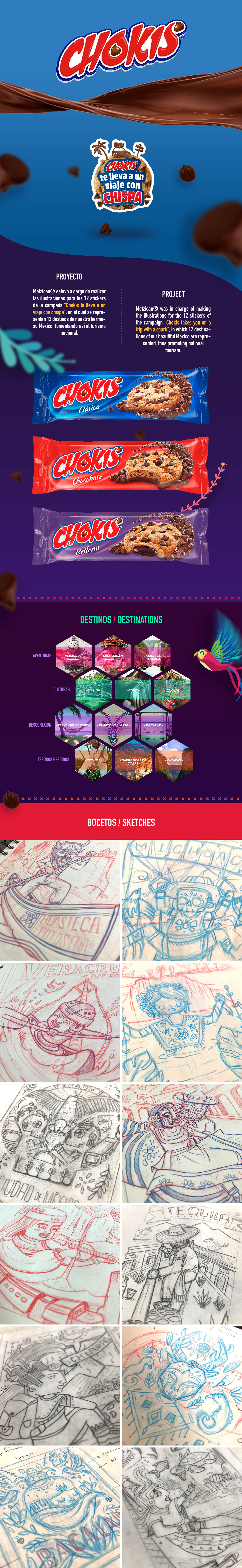 Colección de 12 ilustraciones para stickers para campaña de Chokis titulada "Chokis te lleva a un viaje con Chispa"
