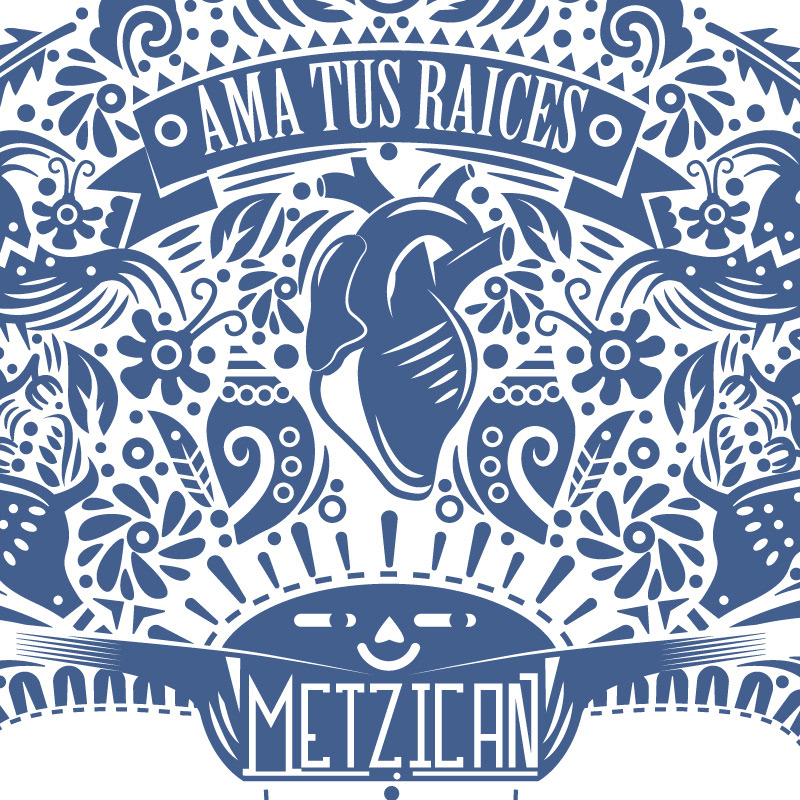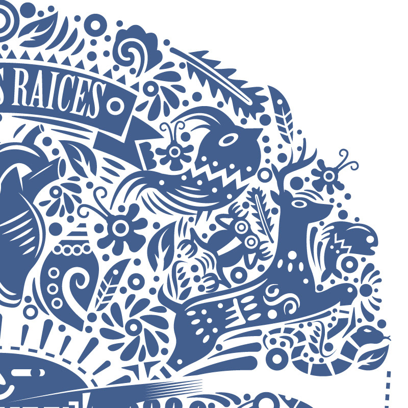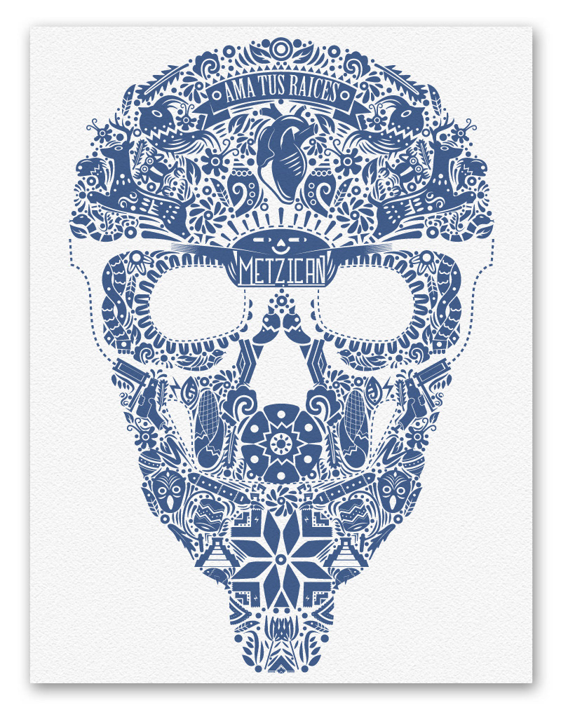 “Love your Roots” it´s a tribute to that wonderful art, characteristic for their shapes and colours, fed by their representative icons of our culture, like “Valeros, trompos, matracas, snails, masks, etc.” The skull used as a container of richness and cultural diversity in which everything gets one.